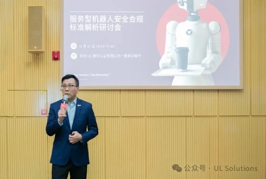 苏州UL美华认证有限公司总经理施峻先生指出此次联合研讨会的目的是为了助力行业人员深入了解服务机器人,更有效地应对标准变化。这也标志着UL Solutions与上电科进一步深化战略伙伴关系,在服务机器人检测认证领域开展更紧密的合作,为国内服务机器人企业提供更便捷的一站式检测认证服务。