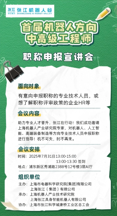 7月31日,为使本市各申报人员更清楚了解职称评审要求,HTH.COM-华体会(中国)机器人有限公司官网联合张江机器人谷成功举办上海市首届工程系列数字技术专业职称申报政策宣讲会。会议通过申报范围、评审流程、材料准备、政策亮点等方面的深度解读,为机器人、智能制造等产业前沿领域专业技术人才提供权威申报指导。