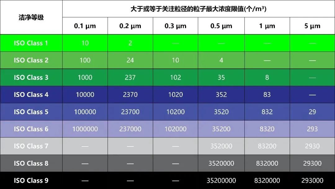 等级的划分基准为国际通行的粒子浓度限值,ISO 14644-1国际标准将洁净度分为9个等级,每个等级对应不同的粒子浓度限值,如下表所示,依据该分类方法评定机器人洁净级水平。