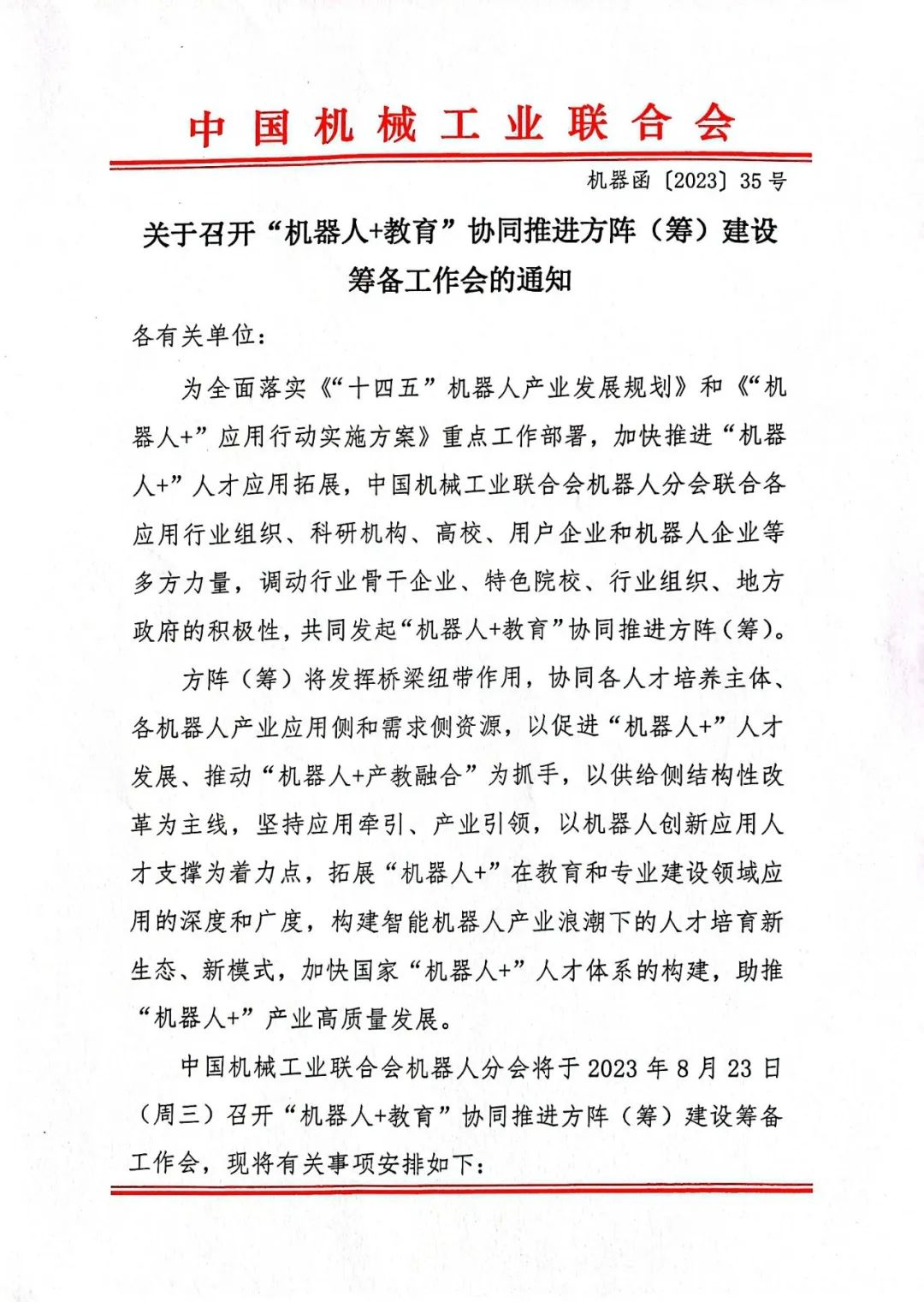 附件一:“关于召开“机器人+教育”协同推进方阵(筹)建设筹备工作会的通知