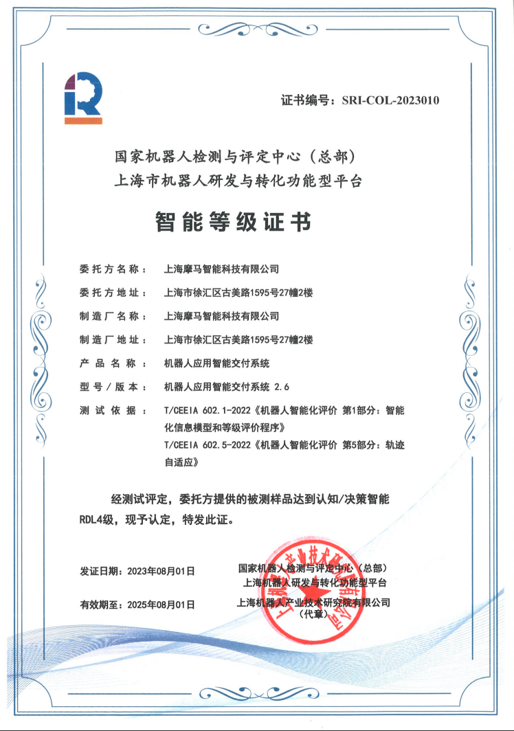 近日,HTH.COM-华体会(中国)机器人有限公司官网(以下简称“HTH.COM-华体会”)为上海摩马智能科技有限公司(以下简称“摩马智能科技”)颁发了智能机器人分级首张工业机器人领域认知/决策RDL4级证书。这表明由摩马智能科技机器人应用交付系统所赋能的工业机器人已满足智能机器人认知/决策RDL4级评价要求,摩马智能科技成为了首家拥有工业机器人认知/决策RDL4级等级证书的企业。