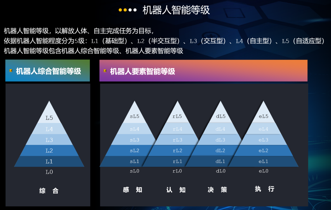 机器人智能等级基于机器人的感知、认知、决策、执行四大要素进行划分,包含综合智能等级、要素智能等级两部分。机器人智能等级依据机器人智能化程度分为五个等级,智能等级从低到高,代表机器人智能程度的提升。